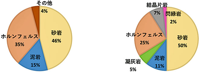 | 打製石斧の石材利用率 左:所沢市の膳棚遺跡(古谷 2016) 右:志木市の西原大塚遺跡(徳留ほか 2022) |
