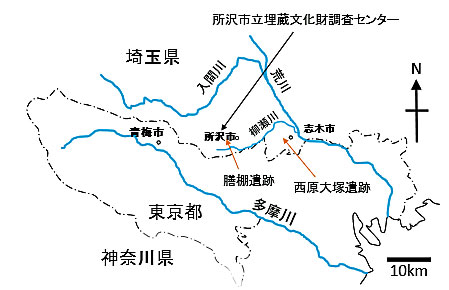 | 所沢市の膳棚遺跡と志木市の西原大塚遺跡の位置図 |