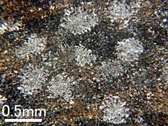 ホルンフェルス礫の岩石薄片菊花の形を呈する菫青石 |