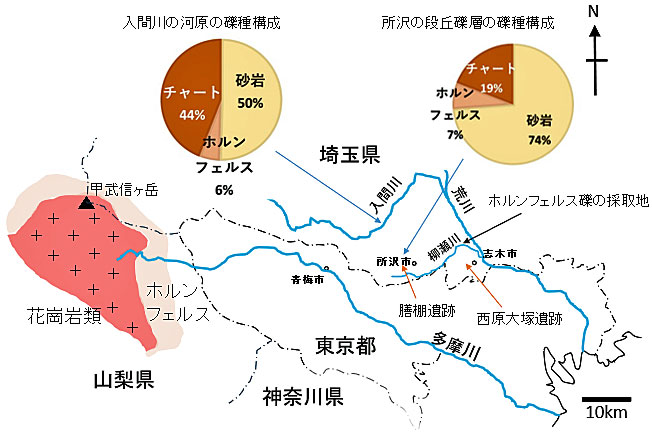 | ホルンフェルス礫の採取地,入間川の川原と所沢の段丘礫層の礫種構成 |