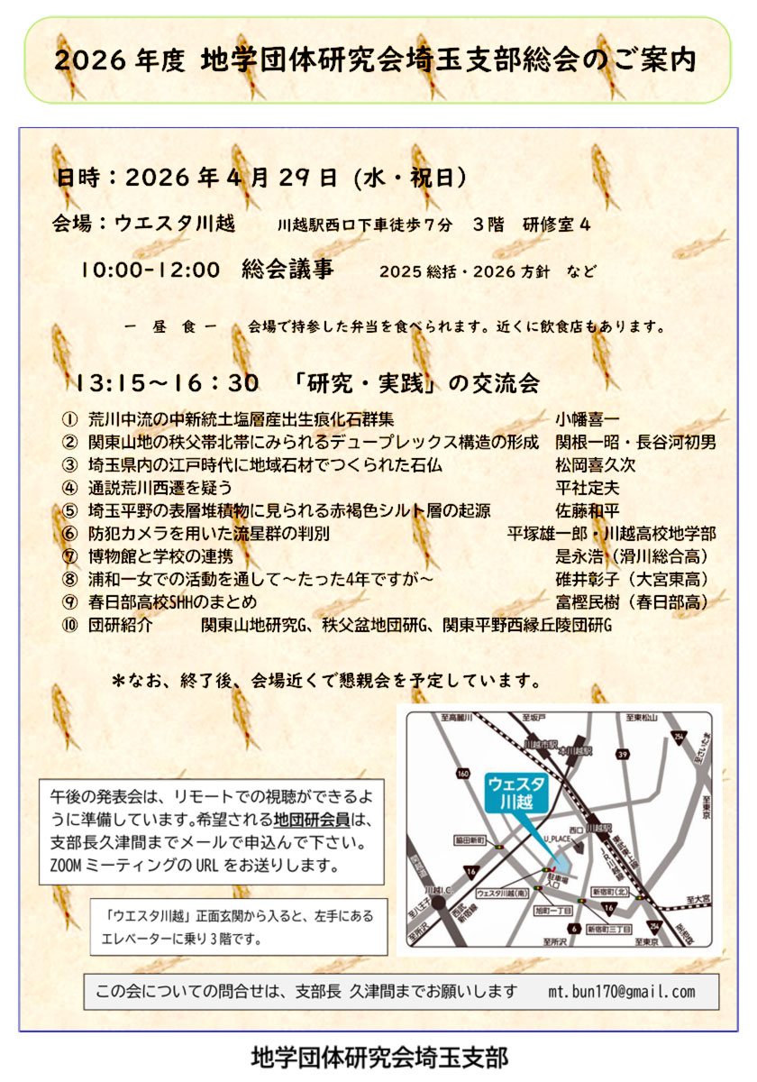* 地団研埼玉支部 新年例会 「下仁田巡検」(2026/1/10–11) * 第77回総会地学団体研究会(2023/8/19-20,ちちぶ) * 地学団体研究会第70回総会(2016,埼玉・小川町) * 地学団体研究会第58回総会(2004,川越)